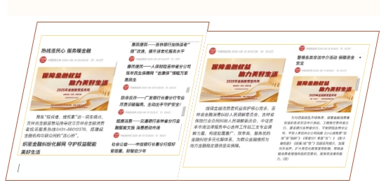 线上方面,依托地方卫视、新闻媒体等权威平台,集中发布吉林省金融消保政策机制示范案例、金融机构为民办实事举措和优秀金融教育作品,扩大宣传覆盖面和影响力。
